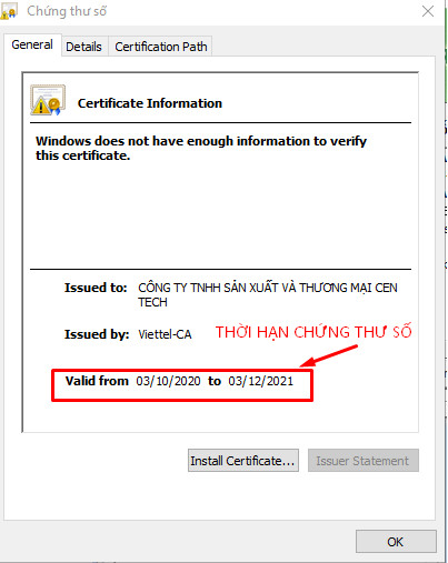 Trong cửa sổ Certificate người sử dụng sẽ tra cứu thời hạn của chứng thư số trong mục Valid from (tham khảo hình dưới)