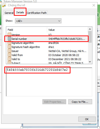 Để xem số Serial của chữ ký số, trong cửa sổ Certificate, người sử dụng chọn thẻ Details, chọn mục Serial Number như hình dưới: