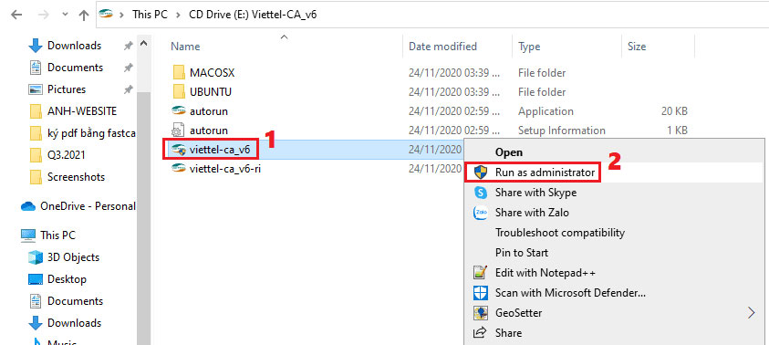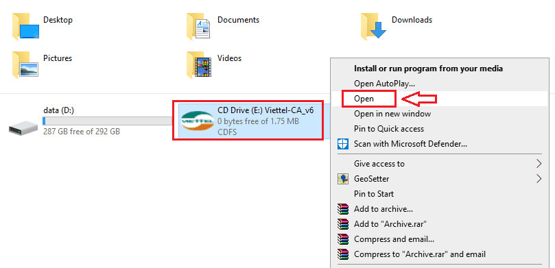 Bước 3: Click chuột phải hoặc click đúp mở file cài đặt chữ ký số Viettel-Ca v6.0