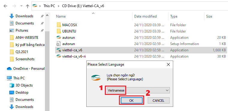 Bước 5: Chọn ngôn ngữ cài đặt và sử dụng mặc định cho phần mềm quản lý chứng thư số Viettel-CA (thông thường chọn ngôn ngữ Vietnamese) => Nhấn “OK” để làm bước tiếp theo.