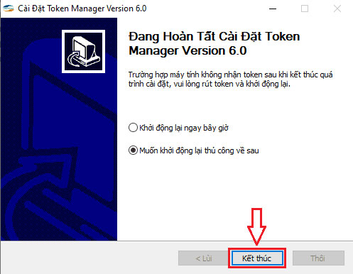 Bước 7: Thông báo quá trình cài đặt Token Manager Version 6.0 trên máy tính đã thành công. Nhấn “Kết thúc” sau đó qua ra mà hình Desktop kiểm tra xem đã thành công chưa nhé.