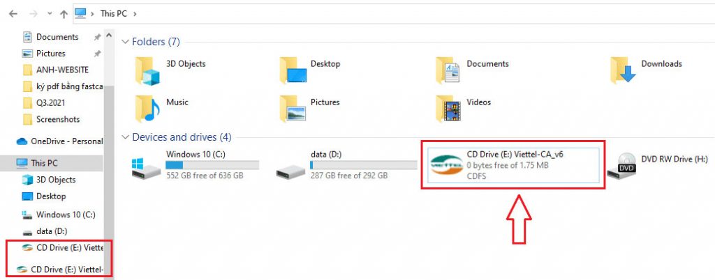 Khi chưa cài đặt, trên màn hình chỉ xuất hiện 3 ổ đĩa là (C:) (D:) (H:), khi cắm Token vào máy tính sẽ hiển thị thêm 1 ổ đĩa (E:) có tên “CD Driver (E:) Viettel-CA_v6” hoặc ổ đĩa có logo Viettel (hình minh họa bên dưới)